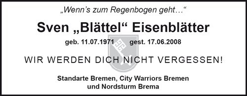 Ihr wißt, daß die kompletten Medien, von Bild, über Weser-Kurier, Radio Bremen und taz bis zu Indymedia fast nur Lügen, Hetze und Halbwahrheiten über den "Ostkurvensaal-Überfall" und den "Angst-Prozess" verbreiten. Antifa-Wichtigtuer wie Thomas Haffke und Andrea Röpke und ihre gewalttätigen Hiwi-Spinner, sowie Trittbrettfahrer von Die Linke, Die Grünen bis zur CDU waren alle nicht dabei, sind aber jetzt die großen Redenschwinger, um ihr persönliches Süppchen zu kochen.