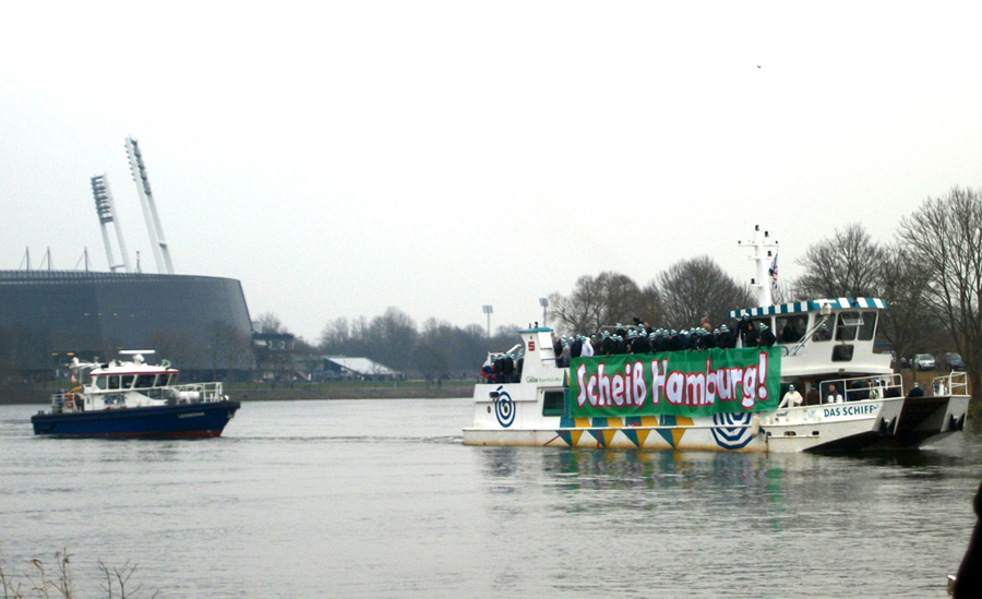„Polizei entert Hooligan-Schiff“, so lautete die Schlagzeile in dem örtlichen „Weser-Kurier“, und das war auch schon fast das einzig korrekte an der Berichterstattung. Noch schlechter - aber mit ein wenig mehr Hetze - sah es in der regionalen “taz“ aus, aber da jeder Aldi-Prospekt mehr Bedeutung hat, als diese langweiligen antifaschistischen Käseblätter, wollen wir uns darüber gar nicht aufregen, sondern lieber die gelungene Schiffahrt auf unserer schönen Weser anläßlich des 100. Derbys feiern. Fast alle erlebnisorientierten Jungs (Männer), die sich in den vergangenen Jahren und Jahrzehnten im und um das Weser-Stadion herum vergnügt haben, waren gekommen und hatten gemeinsam einen schönen Tag, bzw. Tage, denn die letzten Leichtmatrosen der „Alten Garde Essen“ haben wir am Montagmittag nach Hause fahren sehen – Sport Frei! Zu Gast bei unserer feucht-fröhlichen – und immer friedlichen! - Bootsfahrt waren neben den Sportsfreunden aus Essen auch Bochumer und Berliner, die wir immer wieder gerne bei uns willkommen heißen!*